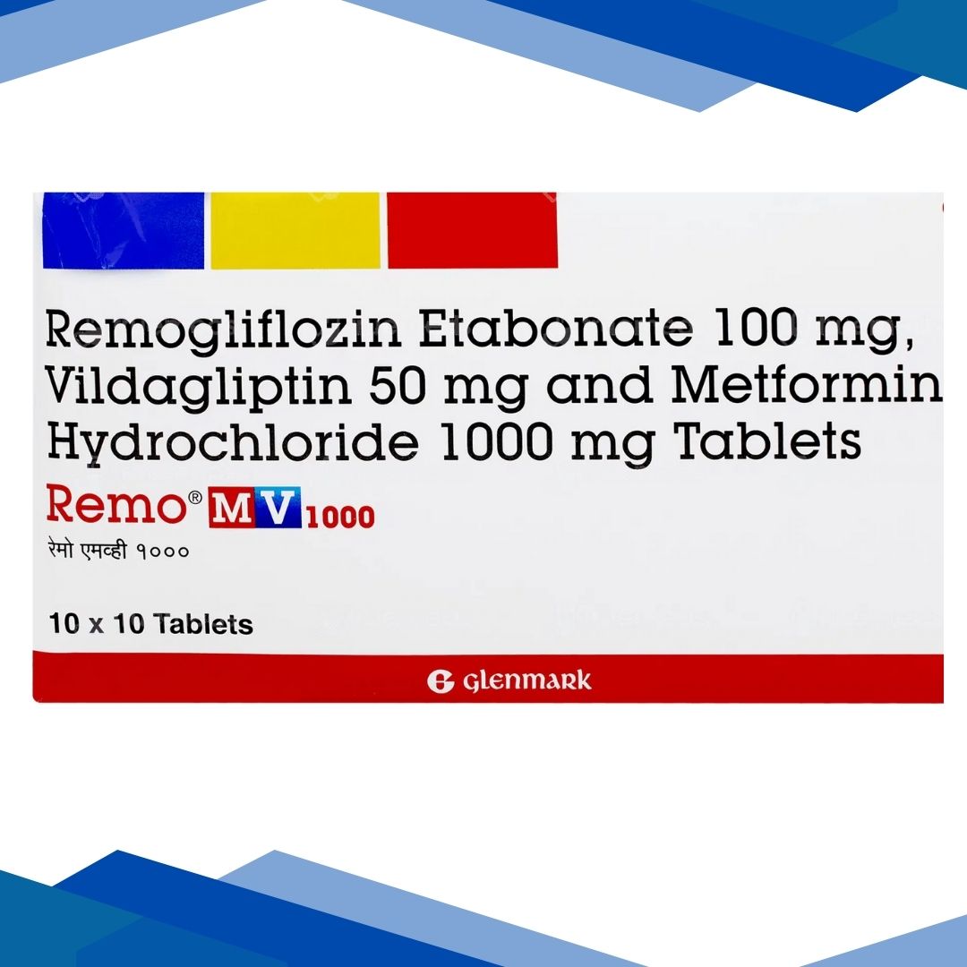 REMO MV 1000 TABLET is a combination of Metformin, Remogliflozin and Vildagliptin which belongs to the group of medicines called Antidiabetic agents. It is used to improve glycaemic control among patients with Type II diabetes mellitus when diet, exercise and other conventional managements does not provide adequate control on blood glucose levels.