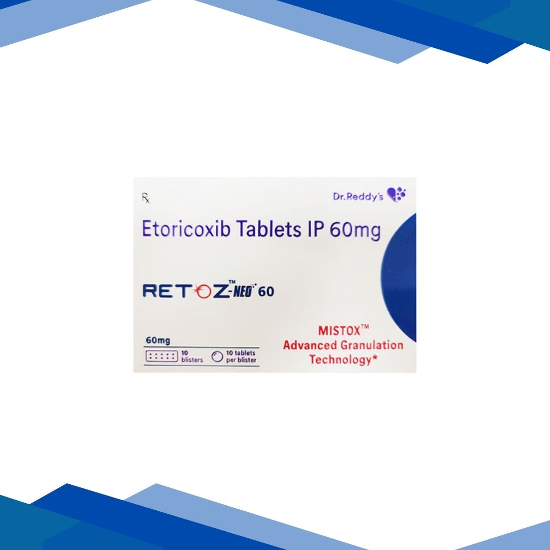 RETOZ NEO 60 TABLET is used to reduce pain and swelling associated with inflammatory bone conditions such as osteoarthritis, rheumatoid arthritis, ankylosing spondylitis (inflammation of the spine), and gout (joint pain caused by excessive accumulation of uric acid in between the joints). It can also be used to reduce pain following a dental surgery. It contains Etoricoxib, which belongs to the group of medicines called Non-Steroidal Anti-Inflammatory Drugs. It works by blocking the release of certain chemicals (prostaglandins) in the body that cause pain, swelling, and inflammation, thereby reducing pain and inflammation associated with inflammatory conditions.