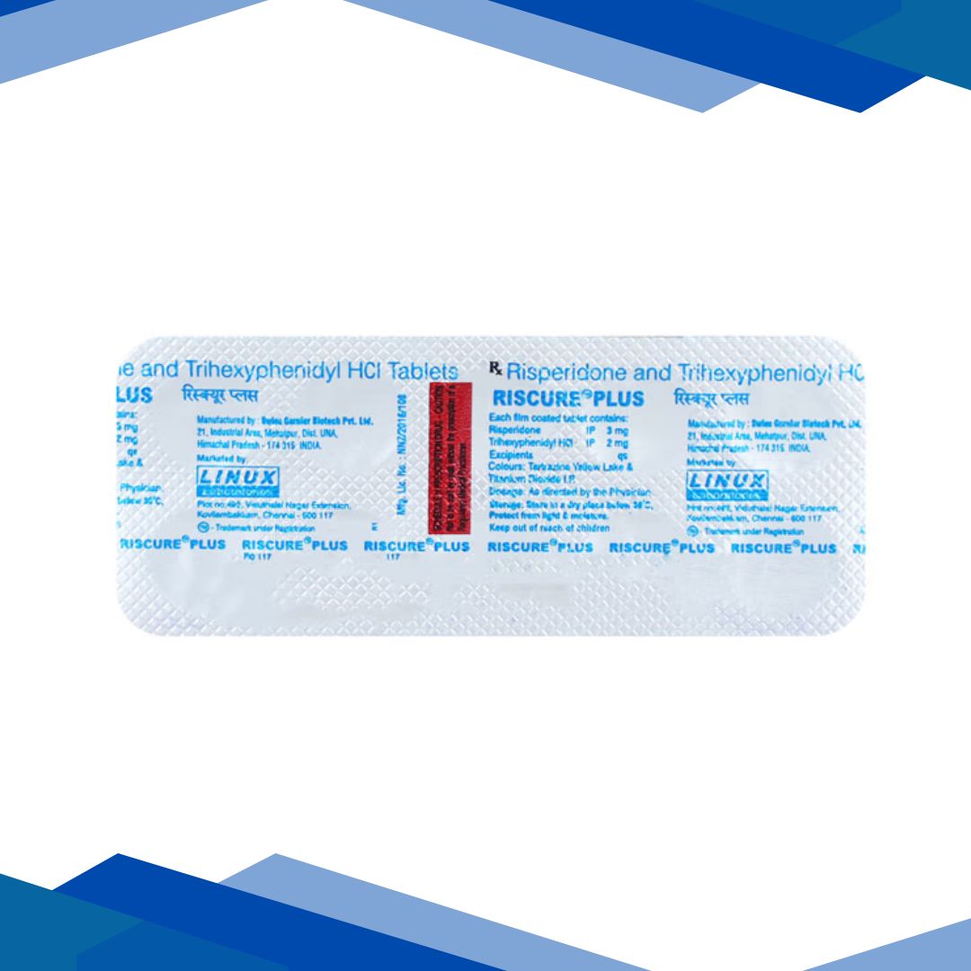 Riscure Plus Tablet 10’S is a combination medicine used to treat schizophrenia and related psychiatric conditions. It contains an antipsychotic that helps manage symptoms like hallucinations and delusions, and an anticholinergic that helps reduce movement‑related side effects that can occur with antipsychotic therapy. For more details kindly click on Medicine Salts below: