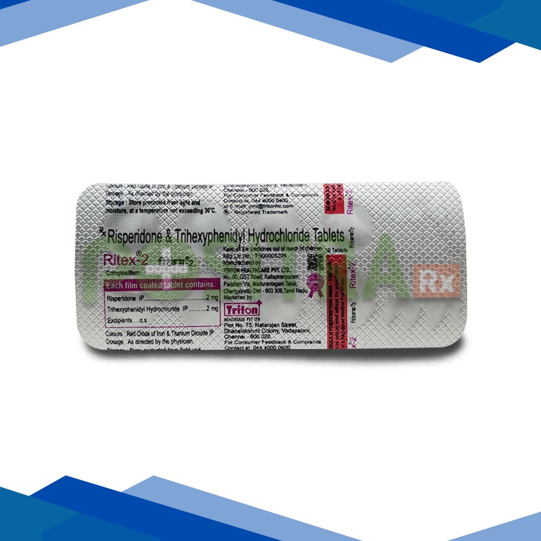 Ritex 2mg Tablet 10’S is a combination antipsychotic medicine containing risperidone and an anticholinergic agent (trihexyphenidyl) used to manage symptoms of schizophrenia and acute manic episodes in bipolar disorder by balancing key chemical messengers in the brain and helping reduce certain movement‑related side effects of antipsychotic therapy. For more details kindly click on Medicine Salts below: