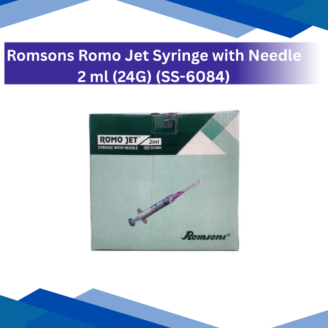 The Romsons Romo Jet Syringe with Needle 2 ml (24G) is a single-use, sterile hypodermic syringe designed for precise fluid administration. It features a 24-gauge, 1-inch stainless steel needle, ensuring minimal discomfort during injections. The syringe is made from medical-grade virgin polypropylene and is individually packed to maintain sterility.