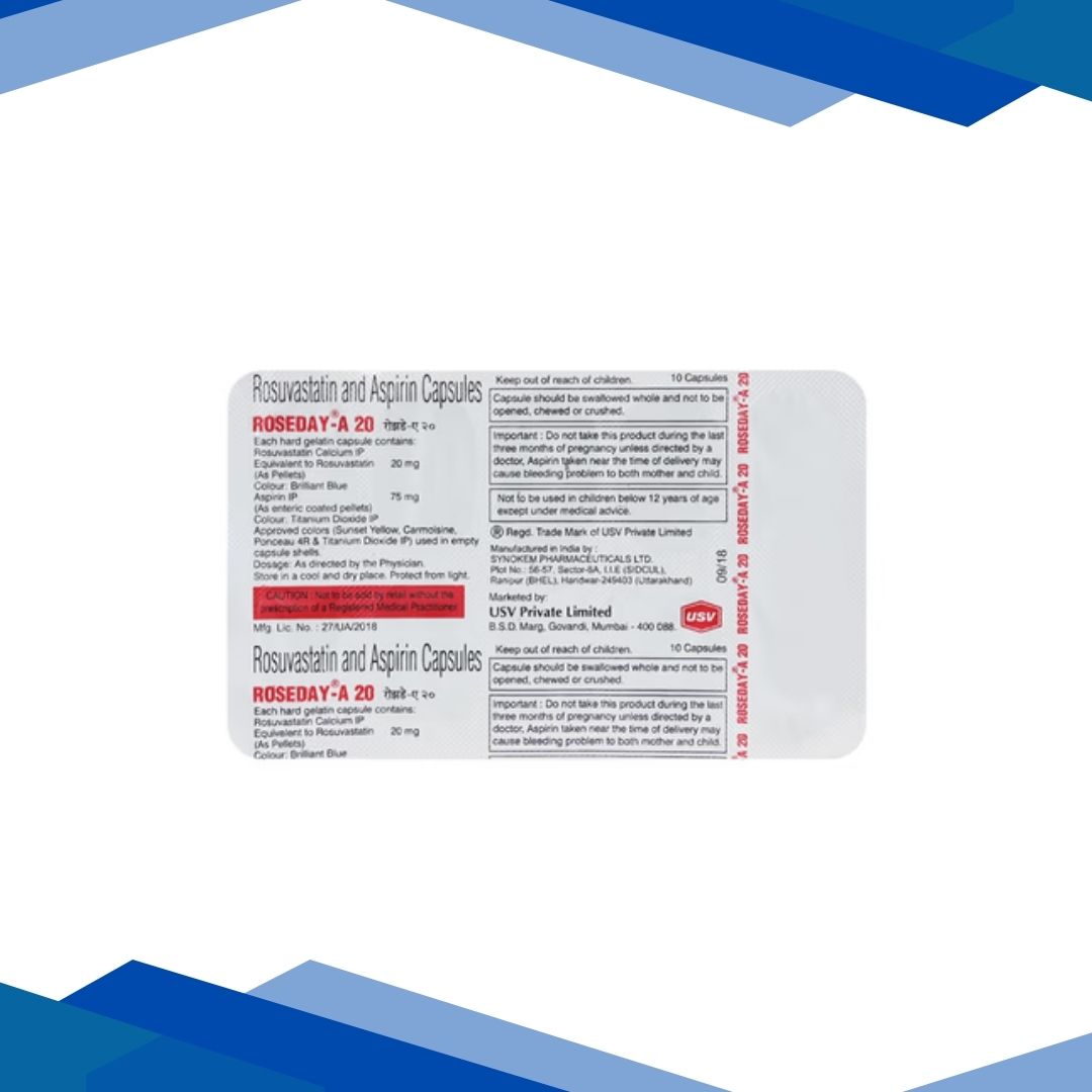 Roseday-A 20 Capsule is a combination of two medicines used to prevent heart attack, stroke, and angina. This medicine reduces the “bad” cholesterol (LDL) and triglycerides (fats) levels. Moreover, it also decreases the formation of blood clots. For more details kindly click on Medicines Salts Below: