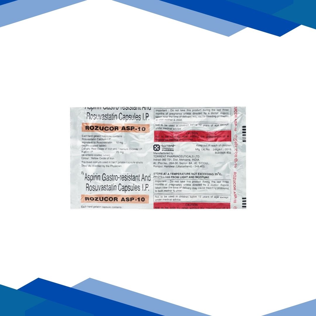 Rozucor ASP 10 Capsule is a combination of two medicines used to prevent heart attack, stroke, and angina. This medicine reduces the “bad” cholesterol (LDL) and triglycerides (fats) levels. Moreover, it also decreases the formation of blood clots. For more details kindly click on Medicines Salts Below: