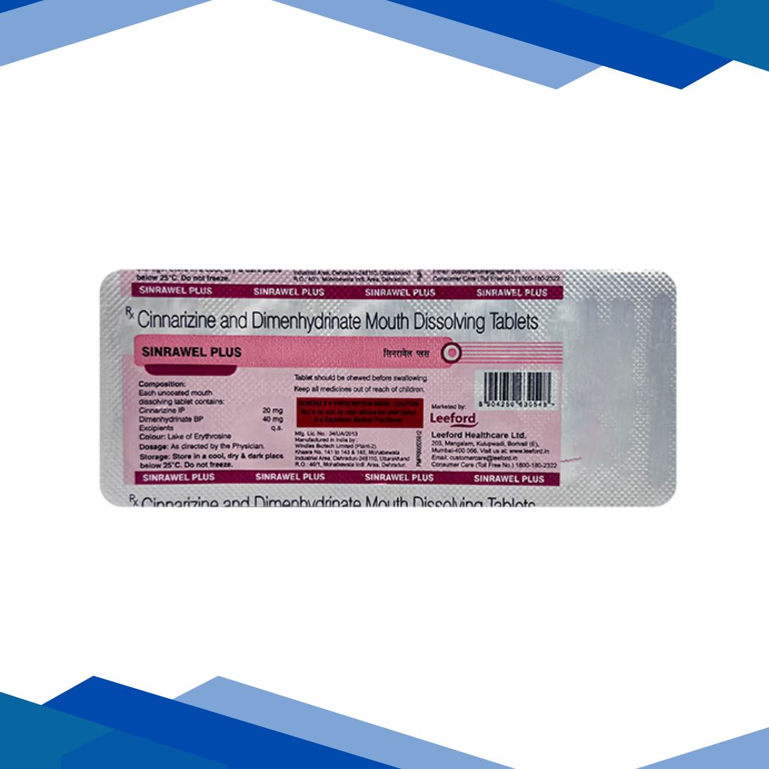 Sinrawel Plus Mouth Dissolving (MD) Tablet (10s) is a combination medication containing Cinnarizine (20mg) and Dimenhydrinate (40mg), primarily used to treat vertigo, dizziness, and motion sickness symptoms like nausea and vomiting. It improves inner ear blood circulation and provides relief from Ménière’s disease-related balance issues.