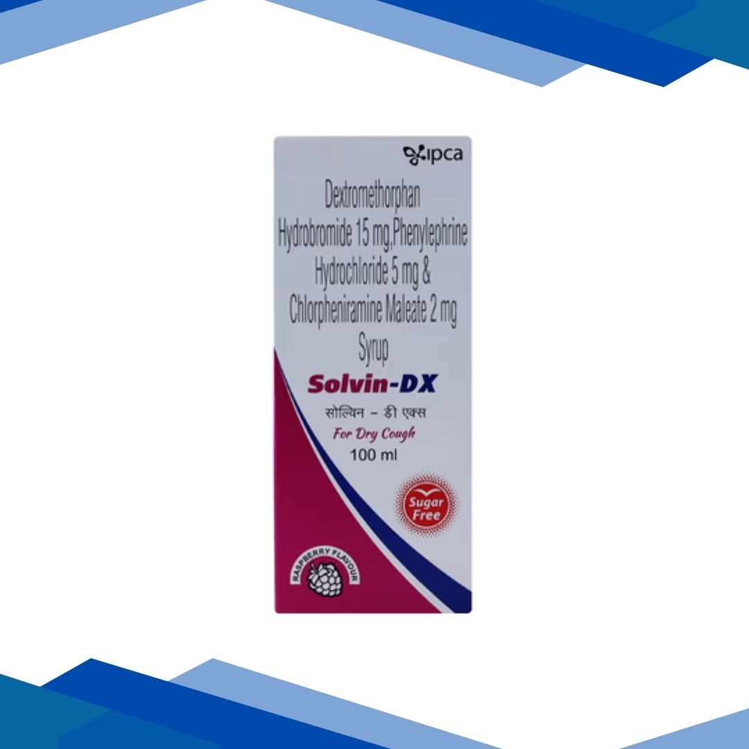 Solvin DX Sugar Free Raspberry Flavour Syrup is an oral cough and cold medicine used to relieve dry cough, nasal congestion, sneezing, runny nose and allergy‑related throat irritation commonly associated with upper respiratory infections by combining a cough suppressant, antihistamine, and decongestant to ease symptoms and improve comfort For more details kindly click on Medicine Salts below: