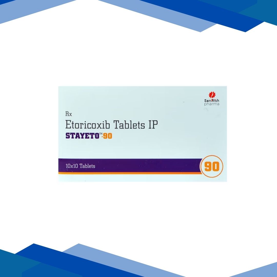 STAYETO 90 Tablet is used to relieve pain and inflammation in conditions such as osteoarthritis, rheumatoid arthritis, ankylosing spondylitis, gout, and other acute painful conditions. It helps reduce swelling, stiffness, and joint pain, improving mobility and comfort. For more details kindly click on Medicine Salts below: