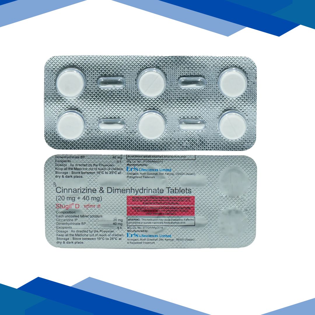 STUGIL D TABLET is a combination of Cinnarizine and Dimenhydrinate which belongs to the group of medicines called Antihistamines & Calcium channel blockers respectively. It is used for the short-term, symptomatic management of vertigo associated with Benign Paroxysmal positional vertigo (BPPV) and migraine in adults, who have not responded to alternative managements.