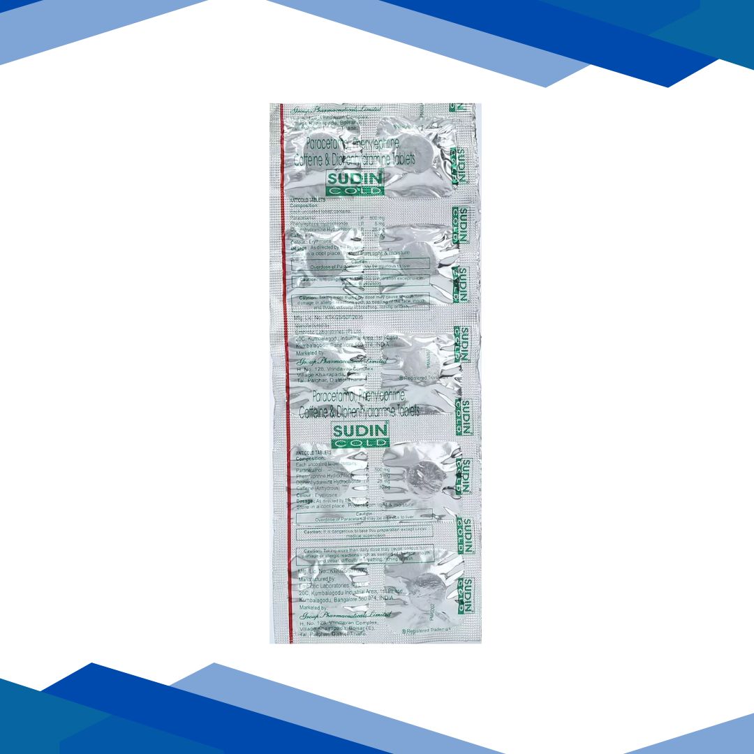 SUDIN COLD TABLET is a combination of Caffeine, Diphenhydramine, Paracetamol, and Phenylephrine which belongs to the group of medicines called CNS Stimulants, Antihistamines, Analgesics-Antipyretics, and Nasal Decongestants respectively. It is used to relieve flu and cold symptoms, headache, body ache, extreme weakness, watery eyes, fever, cough, sore throat, sneezing, runny, and congested nose.