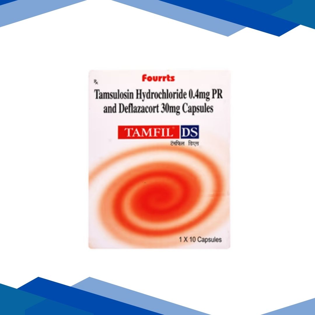 TAMFIL DS CAPSULE is a combination of Deflazacort and Tamsulosin which belongs to the group of medicines called Corticosteroids and Alpha-blockers respectively. It is used in the management of kidney stone by facilitating easy urination. Kidney stones are abnormal hard deposits formed from minerals and salts inside the kidney due to some underlying medical condition or certain medications. It is characterized by severe sharp pain in the either side of the lower back, blood in urine, vague stomach-ache, fever, chills or cloudy urine.