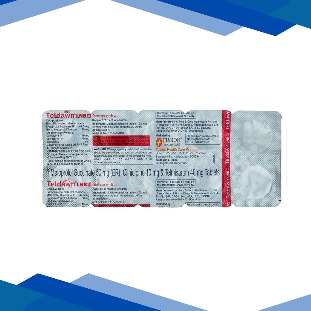 Teldawn LNB 50 Tablet 10’s is used for the treatment and management of high blood pressure (hypertension). It combines three active ingredients that relax and widen blood vessels and help slow heart rate, improving blood flow and lowering elevated blood pressure to support overall cardiovascular health. For more details click on the Medicine Salts below: