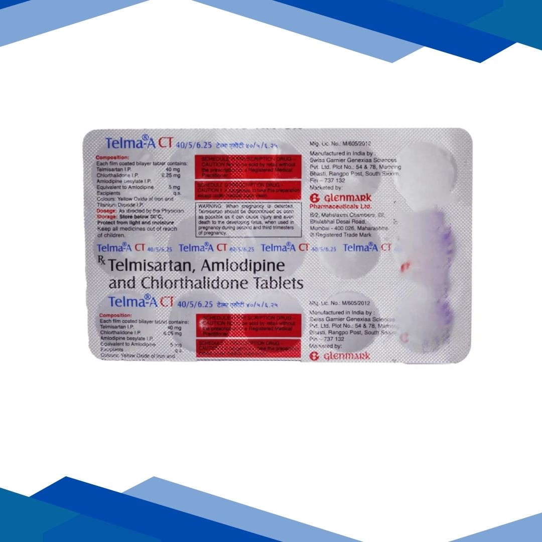 TELMA ACT 40/5/6.25 Tablet is a triple-combination medicine used for the treatment of high blood pressure (hypertension). It helps relax blood vessels, improves blood flow, and removes excess fluid from the body, thereby effectively controlling blood pressure and reducing the risk of heart-related complications. For more details kindly click on Medicine Salts below: