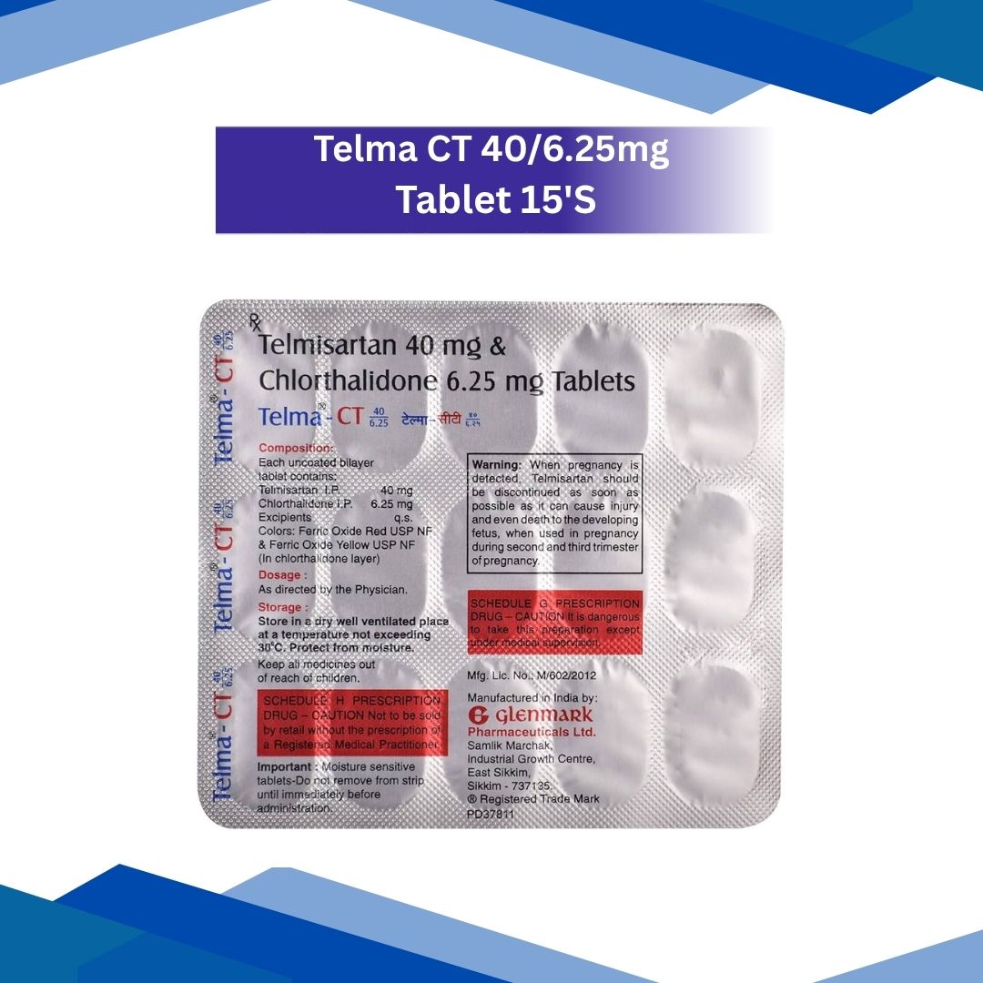 Telema CT 40/6.25 mg Tablet 15’s is used to treat high blood pressure (hypertension). It combines Telmisartan and Chlorthalidone to relax blood vessels and reduce fluid overload, helping manage blood pressure effectively. For more details kindly click on Medicine Salts below: