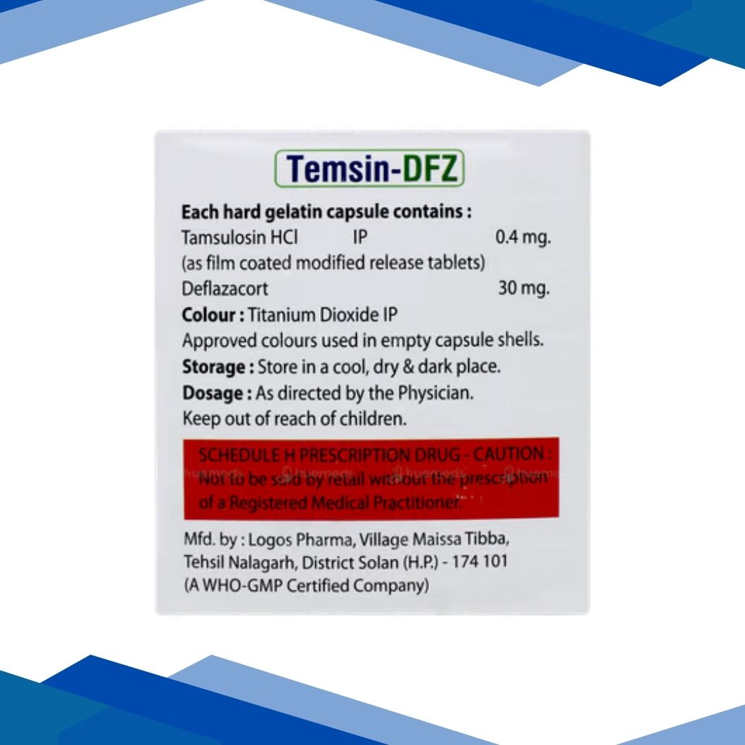 TEMSIN DFZ CAPSULE is a combination of Deflazacort and Tamsulosin which belongs to the group of medicines called Corticosteroids and Alpha-blockers respectively. It is used in the management of kidney stone by facilitating easy urination. Kidney stones are abnormal hard deposits formed from minerals and salts inside the kidney due to some underlying medical condition or certain medications. It is characterized by severe sharp pain in the either side of the lower back, blood in urine, vague stomach-ache, fever, chills or cloudy urine.