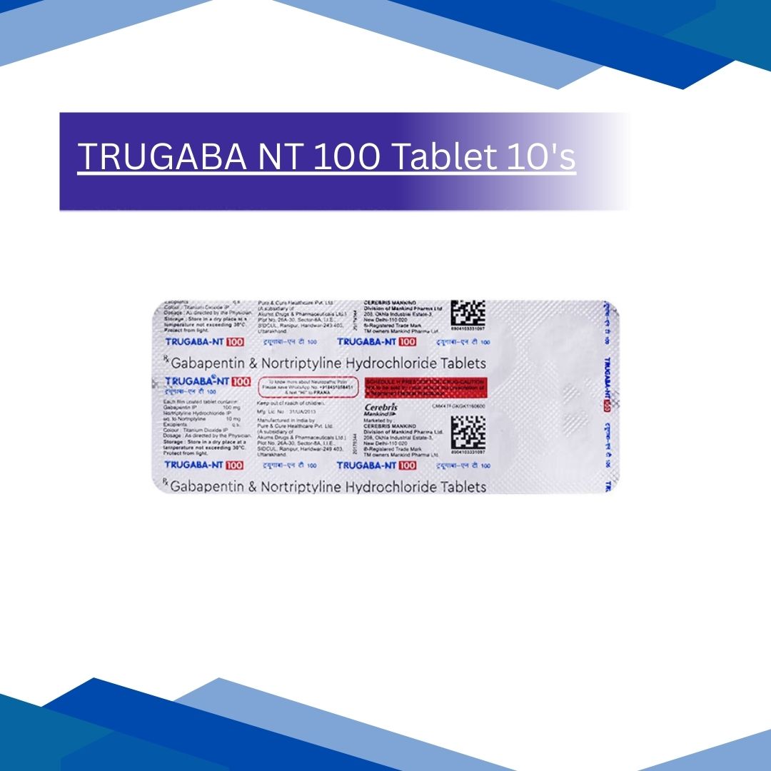 TRUGABA NT 100 TABLET is a combination of Gabapentin and Nortriptyline which belongs to the group of medicines called Anticonvulsant and Antidepressants respectively. TRUGABA NT 100 TABLET is used to manage neuropathic pain in adults. Neuropathic pain is caused due to damage to the sensory nerves usually due to chronic progressive nerve disease, infection, or injury. The pain could be occasional or continuous, which is thought of as a prickling, stabbing, tingling, or burning sensation.