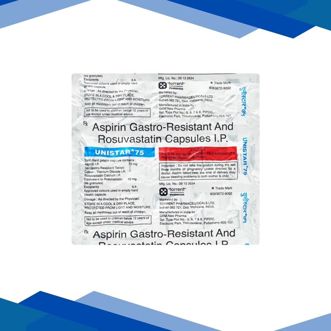 Unistar 75 Capsule is a combination of two medicines used to prevent heart attack, stroke, and angina. This medicine reduces the “bad” cholesterol (LDL) and triglycerides (fats) levels. Moreover, it also decreases the formation of blood clots. For more details kindly click on Medicines Salts Below: