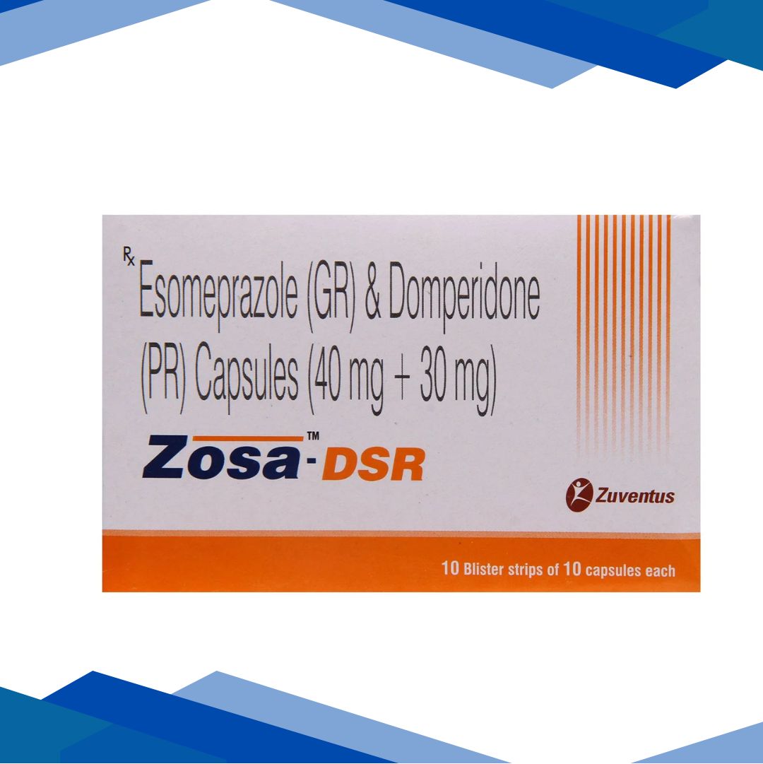 ZOSA DSR CAPSULE is a combination of Domperidone and Esomeprazole which belongs to the group of medicines called Prokinetic Drugs and Proton pump inhibitors respectively. It is used in adults to manage peptic ulcers, gastroesophageal reflux disease (GERD) and Zollinger-Ellison syndrome (tumors in pancreas causing the stomach to secrete more acid). ZOSA DSR CAPSULE acts by reducing the production of gastric acid. It also speeds up the movement of food from the stomach to the intestines, thereby reducing the signs of nausea, vomiting and acid reflux. Due to these actions, it can also reduce the unpleasant signs of GI tract such as nausea, vomiting, indigestion, burping, bloating, acidity or heartburn.